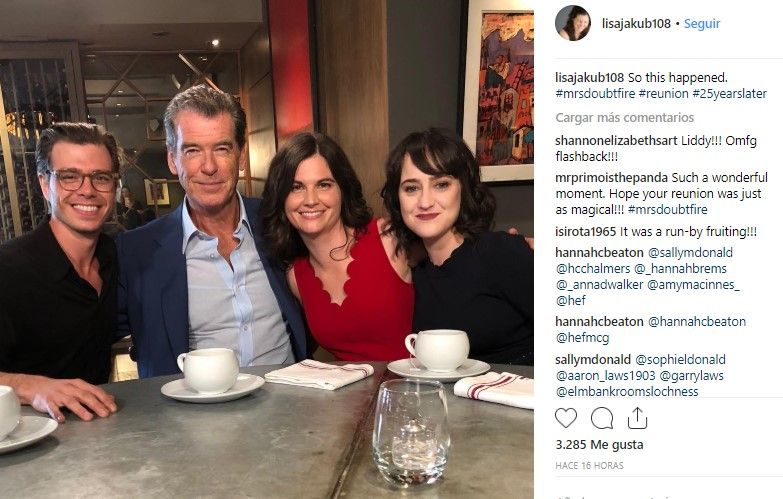 Mediante su cuenta de Instagram, Lisa Jakub, quien tuvo el papel de la hermana mayor Lydia, compartió una fotografía a lado de Matthew Lawrence (Chris), Pierce Brosnan (Stu) y Mara Wilson (Natalie). Cómo pasa el tiempo que parece ayer cuando los vimos junto a Robin Williams protagonizando la conmovedora película, y ahora son personas que superan los 30 años de edad.