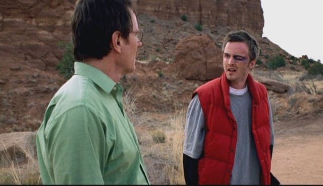 En el primer episodio, el desesperado y aún inocente profesor de química Walter White (Bryan Cranston) ve a su estudiante-dealer Jesse Bruce Pinkman escapar semidesnudo por una ventana y más tarde le propone comenzar el negocio vendiendo la droga que producirían de forma casera: "Tú conoces el negocio, yo sé de química", soltó Walter cual encantador de serpientes.