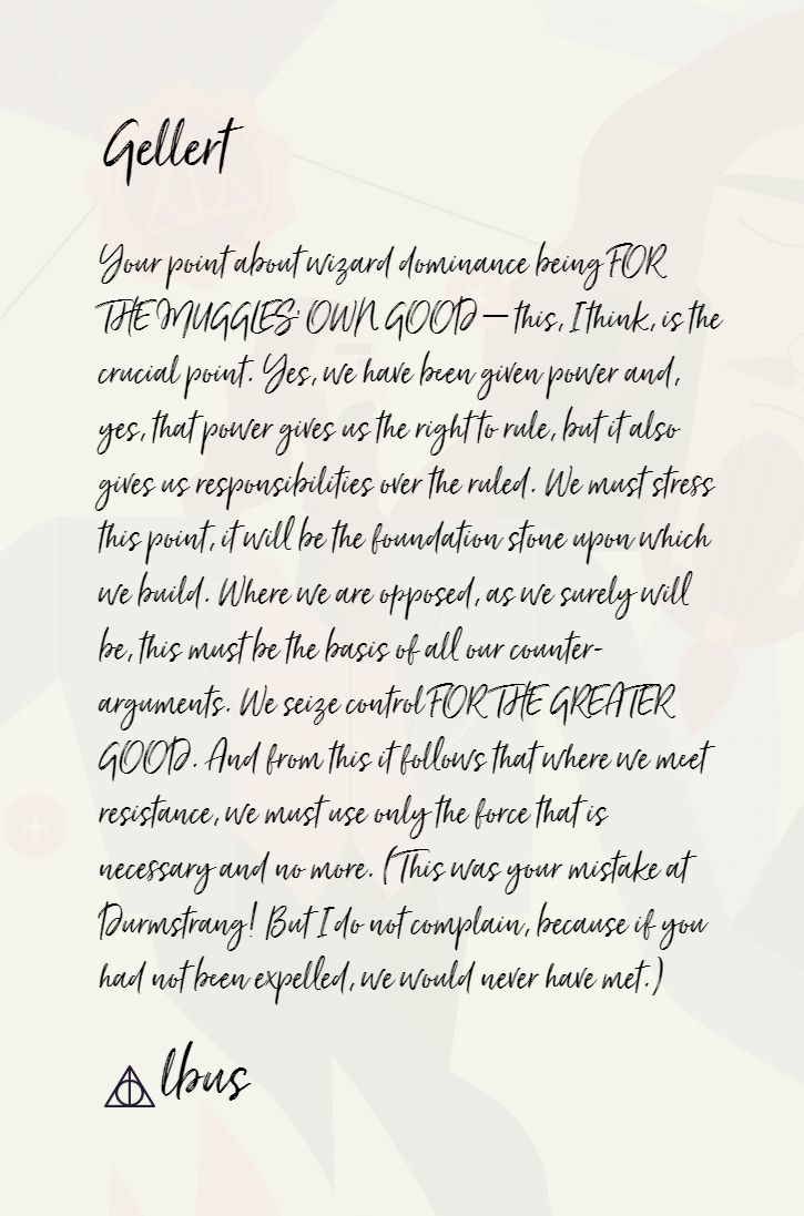 Tu punto sobre la dominación del mago es para el propio bien de los muggles, esto – pienso – es el punto crucial. Sí, nos han dado poder y sí, ese poder nos da el derecho a gobernar, pero también nos da responsabilidades sobre los gobernados. Debemos subrayar este punto, será la piedra de fundación sobre la que construimos. Donde nos oponemos, como seguramente lo haremos, ésta debe ser la base de todos nuestros contraargumentos.
