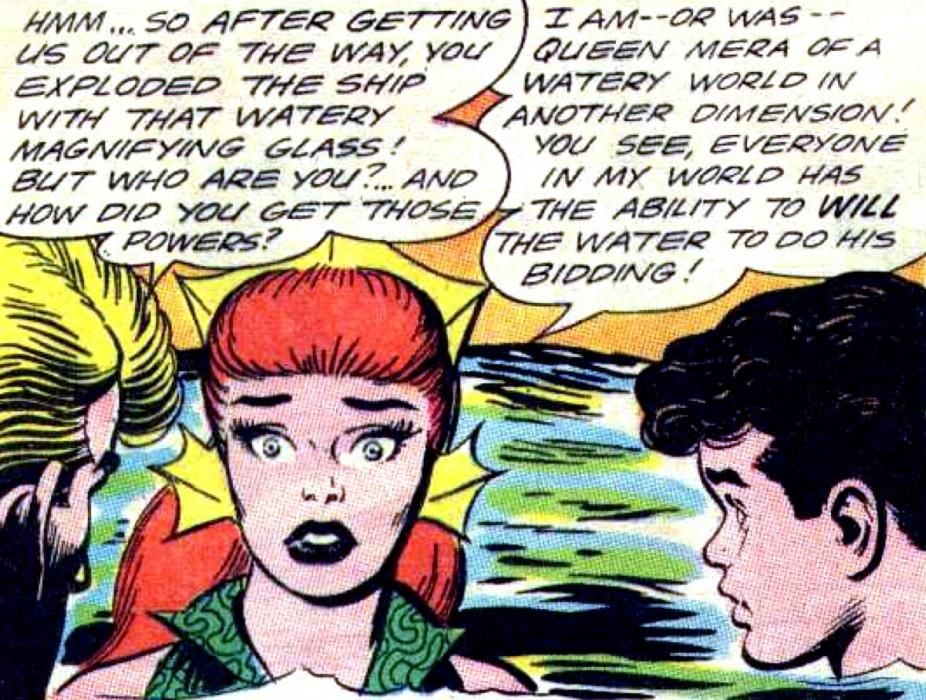 Aquí las cosas no fueron tan inmediatas como la historia bíblica de Adán y Eva. Mientras que Aquaman fue creado en el año 1941, la primera aparición de Mera en los cómics ocurrió hasta 1963, por lo que se llevan más de 20 años de diferencia. Jack Miller y Nick Cardy, dibujaron a Mera como una monarca proveniente de la Dimensión Aqua, que después se sabría era en realidad un territorio llamado Xebel, donde habitaban los exiliados de la guerra civil durante la fundación de Atlántida.