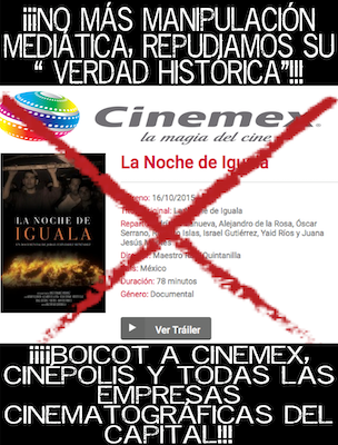 El 16 de octubre llegó a cartelera el segundo. Un controversial docudrama titulado: La noche de Iguala del periodista José Fernández Menéndez y Raúl Quintanilla. Se intentó impedir su estreno en las principales cadenas, incluso a través de change.org (aunque sólo se juntaron 15 firmas). En redes sociales los usuarios incitaban al boicot de las cadenas exhibidoras por estar basada en la "verdad histórica" propuesta por el gobierno federal. Este largo fue el primero que se atrevió a utilizar actores para reconstruir los hechos, incluyendo la colusión de los normalistas con el crimen organizado y la gigantesca pira que desapareció los cuerpos. Hubo amenazas personales contra los realizadores y contra los cines a los cuales, decían, les prenderían fuego. La SEGOB la prohibió para menores de 18 años y para cuando la cinta se retiró, ya se habían contabilizado 8 mil boletos comprados en 29 cines. Fernández presentó un libro con la investigación que sustenta la película y aún tiene planes para darla a conocer a más público.
