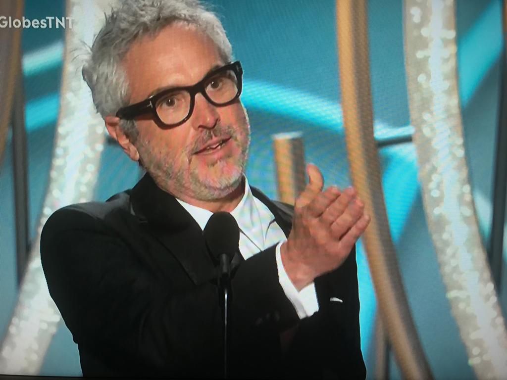 LO MEJOR DE LA NOCHE: Alfonso Cuarón recibiendo el Globo de Oro a Mejor película extranjera y director por Roma, de las manos de Harrison Ford, Catherine Zeta-Jones y Antonio Banderas con la nostálgica canción sesentera de Leo Dan de fondo...