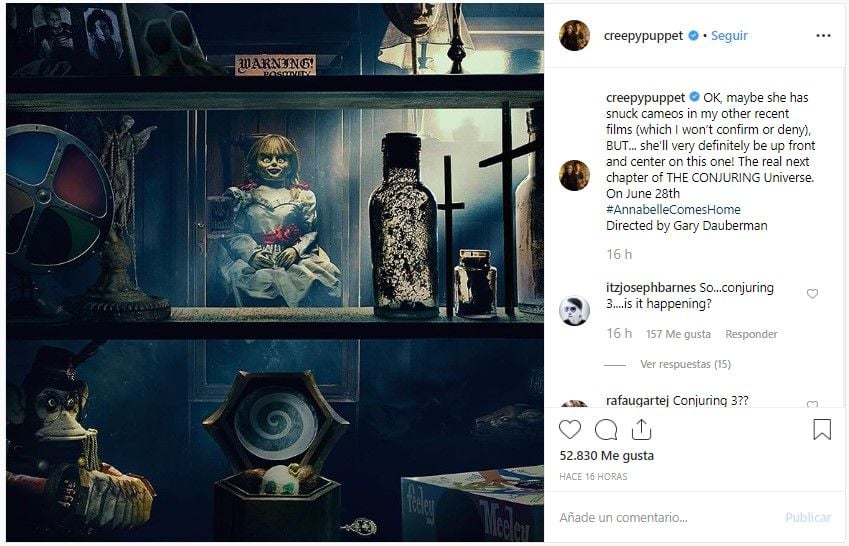 Para la tercera entrega – cuyo nombre oficial recién conocimos hace algunos días – nos prometen una historia que se ambienta muy cerca de los acontecimientos de ‘El Conjuro’, en la que incluso Vera Farmiga y Patrick Wilson – Lorraine y Ed Warren respectivamente – regresarán para interpretar sus papeles, ya que Annabelle despertó en su cuarto de trofeos y manipula a los espíritus que habitan el lugar, y para muestra de lo que podremos ver en la cinta, James Wan – productor de la película – ha compartido la primera imagen oficial.