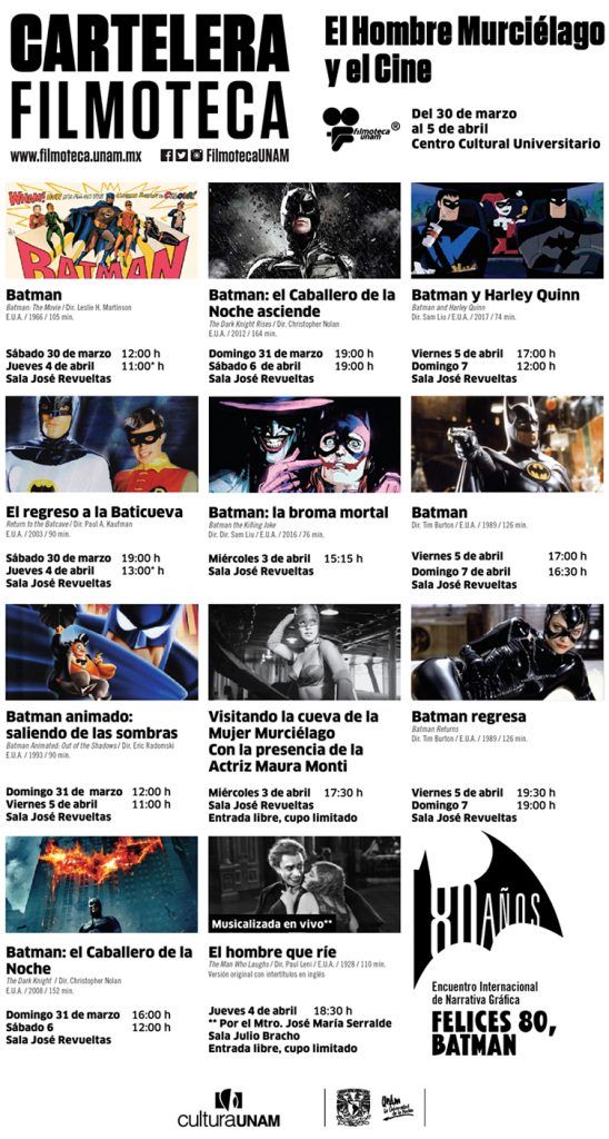 Este recinto perteneciente a una de las universidades más importantes de nuestro país presentará un programa extenso en el que exhibirá 11 películas del 30 de marzo al 5 de abril; entre las seleccionadas están ‘El caballero de la noche’ y ‘El caballero de la noche asciende’, dirigidas por Christopher Nolan; ‘Batman’ y ‘Batman regresa’ de Tim Burton; tres cintas animadas que incluyen ‘La broma mortal’, y hasta la película mexicana, ‘La mujer murciélago’, de 1968.