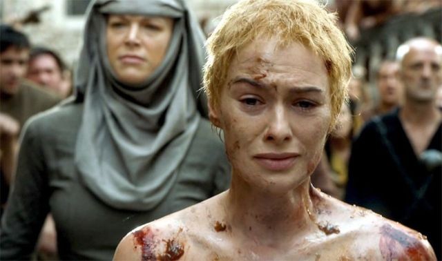 Obviamente, Lena Headey afirma que fue una de las escenas más angustiantes que tuvo que filmar. Aunque la actriz ha realizado varios desnudos dentro de la serie y afirma no tener problema en mostrarse como Dios la trajo al mundo, solicitó que una doble de cuerpo realizara la caminata y que después le fuera injertado su rostro. La actriz, quien fue duramente criticada por la decisión, explicó a varios medios que la escena requería de tres días de filmación 'al natural', y que sintió que no podría representar adecuadamente el estado empcional de Cersei si estaba desnuda todo el tiempo. Por otro lado, Lena tiene hijos pequeños y le pareció que tendría que dar varias explicaciones incómodas por esa escena (¿y por las otras no?).