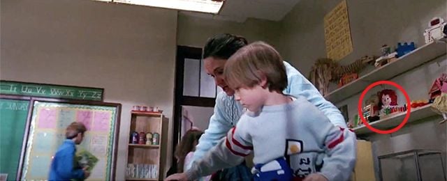 Durante la escena escolar, el niño es castigado por la señorita Kettlewell (Beth Grant) al interrumpir una de sus clases. Esto fue un acto injusto ya que el pequeño protagonista era molestado por el típico abusivo del salón. Y es aquí cuando vemos a la icónica Annabelle en el fondo de la escena sentada en una repisa con otros juguetes, pero mucho ojo que se trata de la versión original de esta muñeca, no la de las películas.