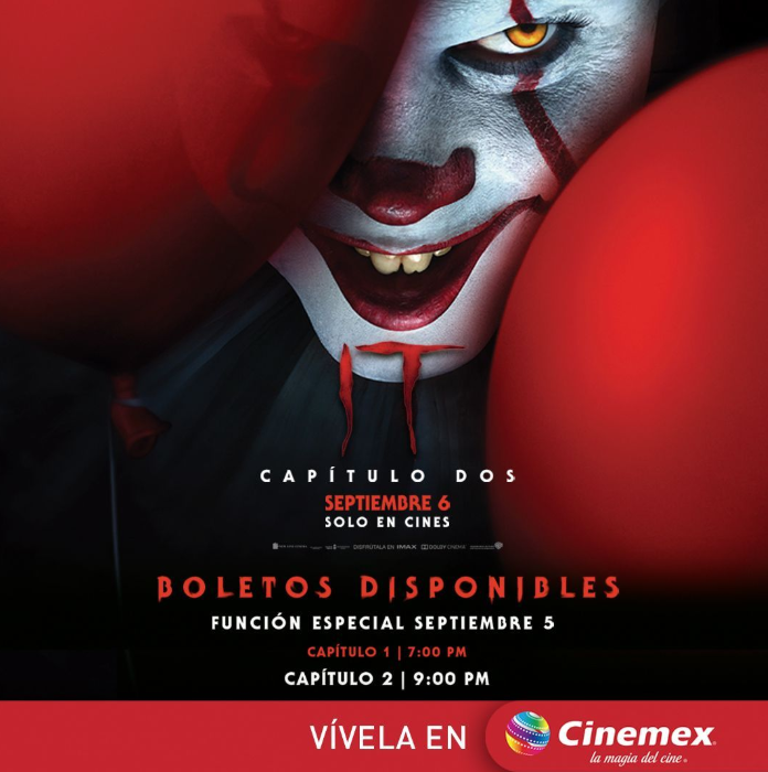 Ahora que estamos a unos días del estreno, ya se pueden adquirir los boletos en preventa, para que seas de los primeros en ver esta cinta de terror. Inclusive, Cinemex tendrá una función especial el próximo 5 de septiembre en la que pasará la primera entrega de IT, seguido del estreno de la secuela, para así no perder ni un detalle sobre los acontecimientos de Derry.