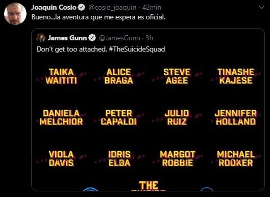 Hace ya rato que James Gunn no aparecía con nada significativo en Twitter y hoy lo ha hecho para revelar al elenco completo de su próximo proyecto: The Suicide Squad. Por supesto, para nosotros la mayor sorpresa ha sido encontrarnos con que nuestro querido Joaquín Cosío será parte de la película. Aún no se ha revelado su personaje, pero suponemos que por el tema de la película y el perfil del actor mexicano, obviamente podría ser algún anti-héroe, aunque apostamos por el villano más malo de todos.