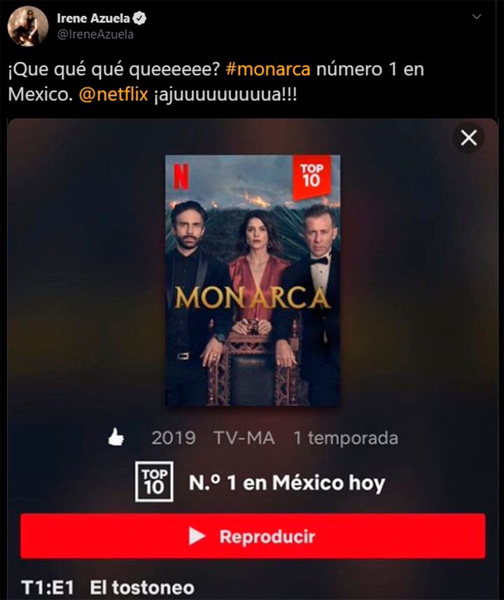 No deja de ser entretenimiento y quizá no aporta realmente nada nuevo a la industria, pero su ritmo es tan afectivo que vuelve al televidente adicto. Salma Hayek e Irene Azuela mostraron en sus cuentas de Instagram y Twitter respectivamente, su entusiasmo al haber llegado a los primeros lugares de audiencia. Cabe mencionar que Netflix acaba de implementar hace unas semanas, dentro de la plataforma el poder acceder a este top en el cual podemos ver las tendencias.