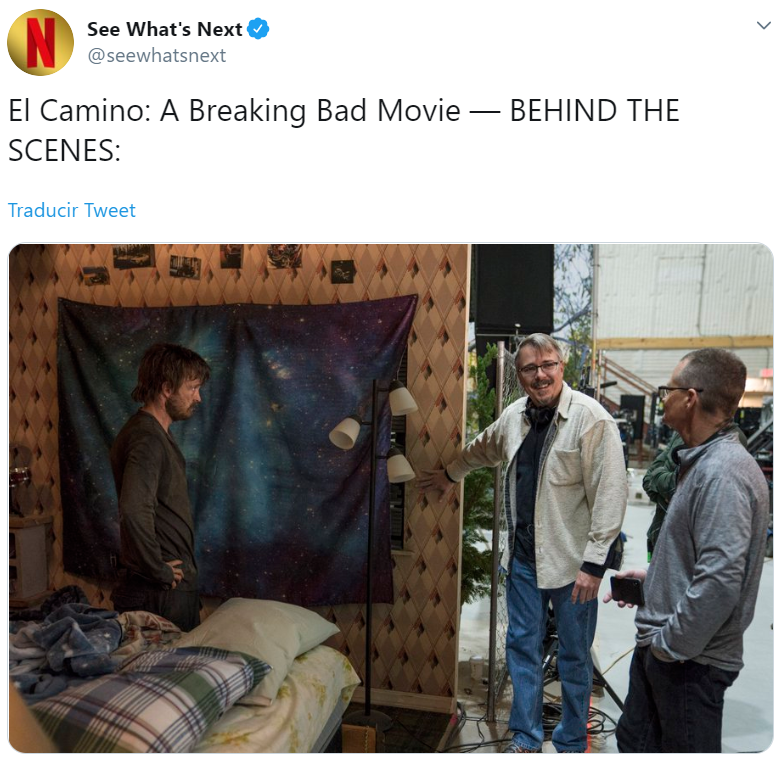 Mediante la cuenta oficial de Twitter de See What’s Next (que también pertenece a Netflix), han publicado una fotografía detrás de cámaras en la que Jesse probablemente recién llegó a un hotel o cuarto después de haber escapado de su cautiverio gracias al sacrificio de Walter White (Bryan Cranston). Y es que la apariencia del personaje está prácticamente intacta de como apareció en el episodio final de la serie: aspecto desaliñado, sucio, barba crecida y cara de pocos amigos. A lado de él se encuentra el director del proyecto, Vince Gilligan y alguien más de la producción.