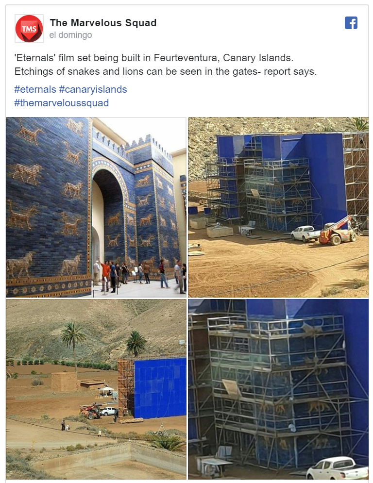 De la misma forma, se estrenaron otras fotografías en las que miembros de la producción están construyendo un arco que funge como réplica de la Puerta de Istar, la entrada a Marduk, en Babilonia, un templo que veneraba a la diosa Istar. En ese lugar suceden cosas interesantes para los Eternals, por lo que probablemente sea una locación importante.