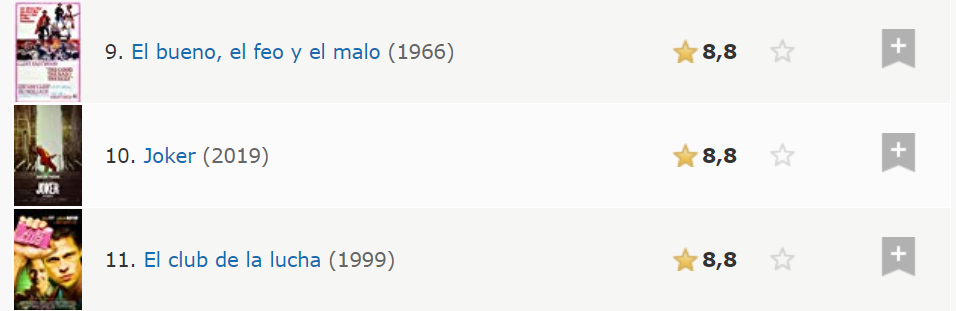 Cabe destacar que conforme pase el tiempo y más usuarios califiquen la película en el sitio, la posición de Joker podría bajar, incluso al grado de quedar fuera del top 100, ya que la cinta que cierra la lista (El chico) tiene 8.2. De cualquier forma, es interesante notar el gusto del público por esta película y la aceptación que está teniendo, lo que probablemente le otorgue el título de clásico a la postre.
