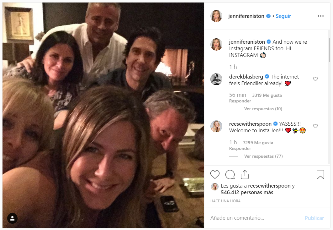 Hasta el momento de escribir esta nota la imagen en la que aparece Aniston, Courteney Cox, Matthew Perry, Lisa Kudrow, Matt LeBlanc and David Schwimmer lleva más de medio millón de likes en poco más de una hora de su publicación, por lo que se ha vuelto viral y se une a los festejos por el 25 aniversario del estreno de la serie.