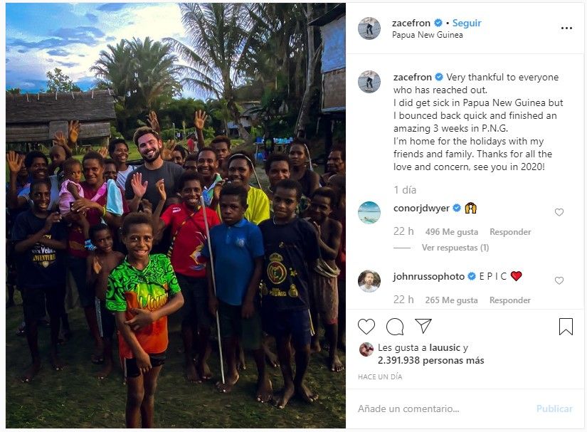 Zac recurrió a sus redes sociales para pronunciarse al respecto de su estado de salud, ya que la noticia evidentemente cobró notoriedad y el actor quería agradecer las muestras de cariño de sus seguidores: “Muy agradecido con todos los que han contactado conmigo. Me enfermé en Papúa Nueva Guinea, pero me recuperé rápidamente y terminé unas increíbles tres semanas de grabación. Estoy en mi casa para las fiestas con mi familia y amigos. Muchas gracias por todo el amor y la preocupación. Nos vemos en 2020.”