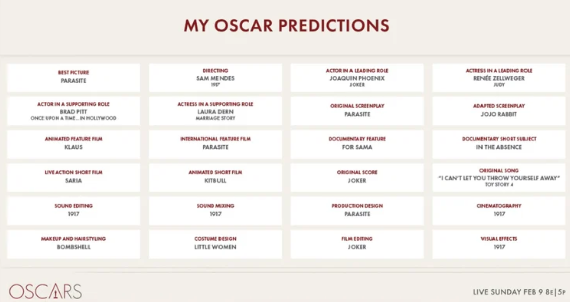 En las categorías de actores principales y de reparto sí acertaron en todas, pero no era algo complicado de hacer, ya que Brad Pitt, Joaquin Phoenix, Renée Zellweger y Laura Dern se llevaron el Oscar por sus respectivos trabajos, pero prácticamente era trámite, ya que obtuvieron la mayoría de los premios que se entregaron, como los Globos del oro, los BAFTA, los SAG Awards, etc.