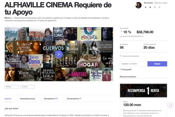 Cinépolis: Ya están abiertos los primeros cines en MéxicoEn reconocimiento por los donativos y por el apoyo de aquellos que podamos contrarrestar esta peligrosa tendencia, Alfhaville ofrece un intercambio: A quienes apoyen por esta campaña, les corresponde acceso a títulos disponibles en la plataforma de la distribuidora como la estupenda Tres rostros, ganadora de Berlín o la joya francesa de epoca La mujer que sabía leer. "En agradecimiento por su ayuda, estamos promoviendo que la gente vea cine de arte o cine mexicano alternativo desde casa. Es importante que la gente también vea películas hechas por profesionales que no necesariamente pasaron por el cine comercial", añadió.