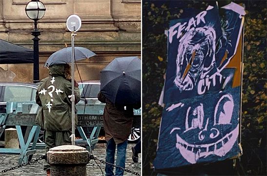 Otra cosa que brinca sobre las fotos reveladas es que vemos a un probable secuaz de El Acertijo (Paul Dano), ya que hay una persona con una chamarra que en la parte trasera tiene un signo de interrogación. Además, hay unos carteles que menciona el miedo en la ciudad y una cara alegre, por lo que parece que es trabajo de uno de los potenciales villanos de The Batman.