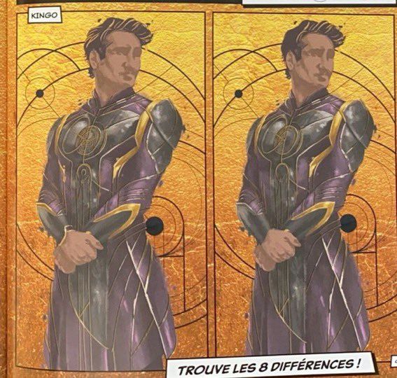 La revelación llega gracias a un álbum de estampas y Kingo tiene una actividad de encontrar diferencias entre las dos imágenes, por lo que sirve perfecto para echarle un vistazo a este superhéroe. Curiosamente, la imagen no fue colgada en redes sociales debido a un juguete, como ocurrió cuando Filtraron el primer vistazo a Salma Hayek como Ajak con todo y su traje, sino que es un artículo de papelería, así que realmente hay muchos promocionales ya disponibles que contienen cosas no antes vistas de la cinta.