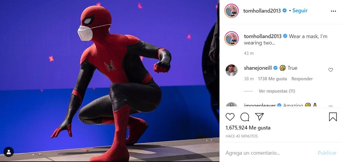 En ella se ve al trepa muros con el traje de Spider-Man: Lejos de casa, sin embargo, la gran diferencia es que el superhéroe lleva un cubrebocas puesto, por lo que Holland compartió por escrito: “Usa una máscara, yo llevo dos…”, a manera de una campaña para tratar de incentivar el uso de cubrebocas en las personas debido a la situación mundial actual. Eso sí, al fondo hay una pantalla azul con varias marcas rojas en ella, por lo que estaban grabando alguna escena que requiere efectos visuales en la postproducción.
