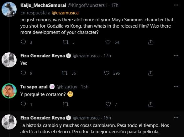 En Twitter le preguntaron a Eiza si su papel tenía más escenas, a lo que la actriz mexicana que estuvo en Hobbs and Shaw y Baby Driver respondió que sí y extendió un poco su argumento: “La historia cambió y muchas cosas cambiaron. Pasa todo el tiempo. Nos afectó a todo el elenco. Pero fue la mejor decisión para la película”, con lo que confirma que grabó las secuencias, aunque por algún motivo decidieron sacar varias del corte final, probablemente en favor de hacer más fluida la trama y más corta, ya que por increíble que parezca Godzilla vs. Kong dura poco menos de dos horas.
