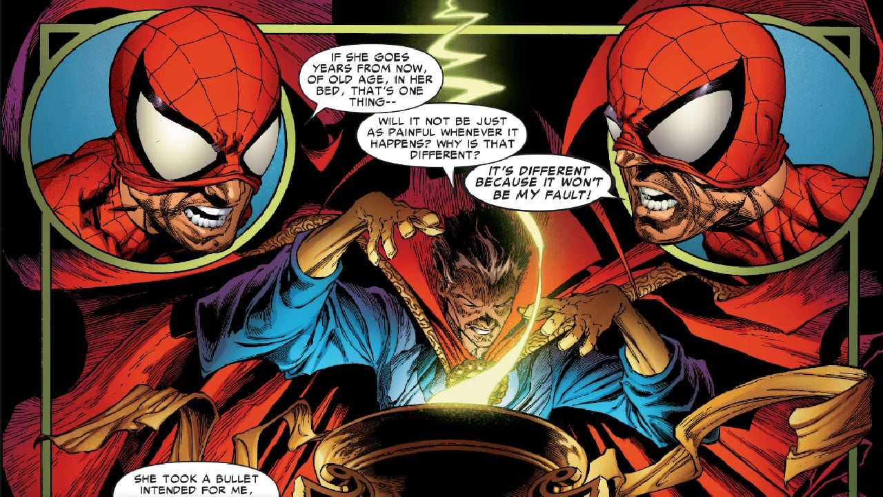 Otra pista es que en este tomo editado hace 57 años también tiene la presencia de Doctor Strange, pero eso ya sería soñar mucho, pues Peter también recibe ayuda Los Cuatro Fantásticos, Thor, Ant-Man, Capitán América, entre otros. Hablando del Hechicero Supremo, vuelve a colaborar con Spider-Man en el especial de cuatro partes One More Day donde busca salvar de la muerte a la Tía May recurriendo a instancias mágicas y hasta al mismo Mephisto, otra de las posibilidades que han saltado al cúmulo de posibilidades.