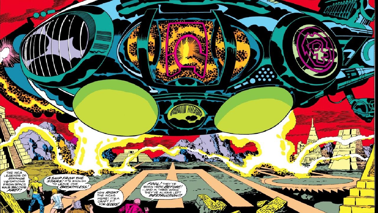 Otras de las grandes fascinaciones de la época fueron las figuras extrañas que se dibujaron en gigantescas hectáreas de campos de cultivo en el mundo, obras casi imposibles de trazar con tremenda exactitud y con simbolismos ajenos a los lenguajes registrados por la humanidad. Así que Kirby utilizó los campos de los Andes, en Perú, para trazar señales en los campos que no advertían el regreso de las futuras huestes de Celestiales a la Tierra. Sí, también M. Night Shyamalan lo dijo en Señales, con Mel Gibson y Rory Culkin. Como verán, la ufología también forma parte de la Casa de las Ideas y del MCU.