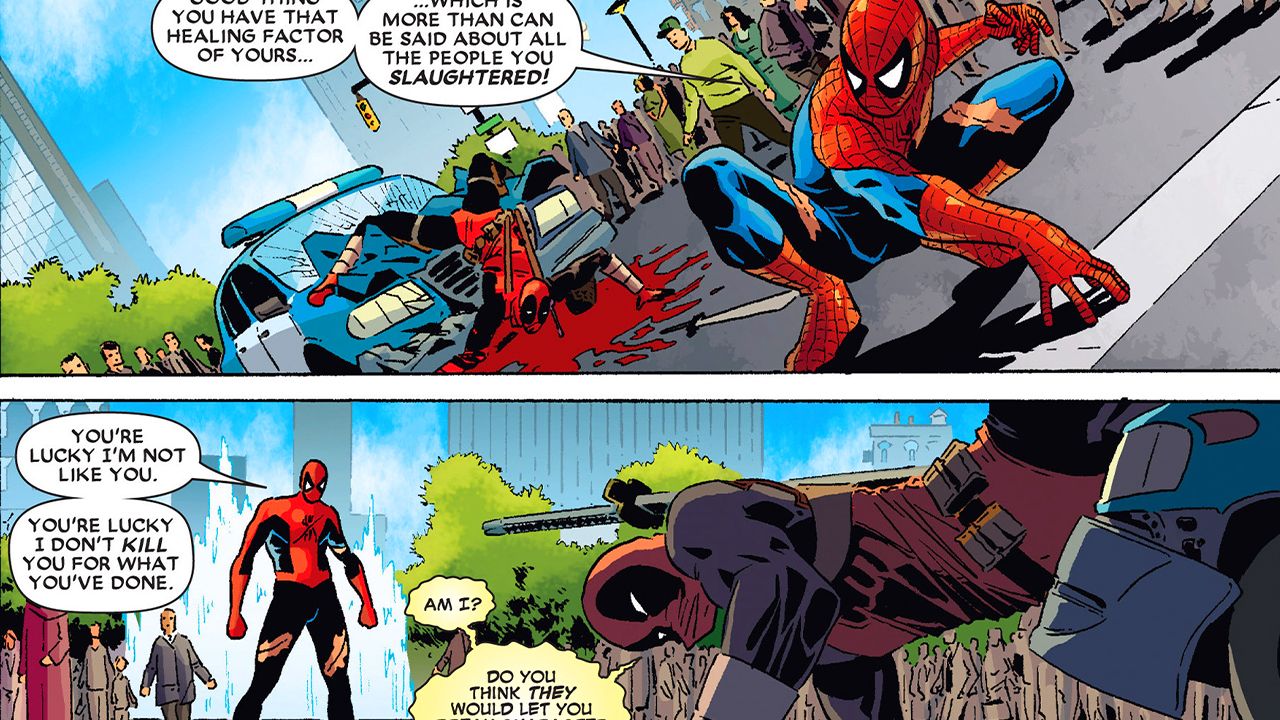 Esto termina con un gran número de personas acercándose al cadáver de Spider-Man mientras gritaban: "¡mató a Spider-Man!", "¡alguien debe detenerlo!". Y con un cuerpo aún herido por el combate, Deadpool finalizó: "eso fue divertido… asombroso, incluso. ¿Quién sigue?".