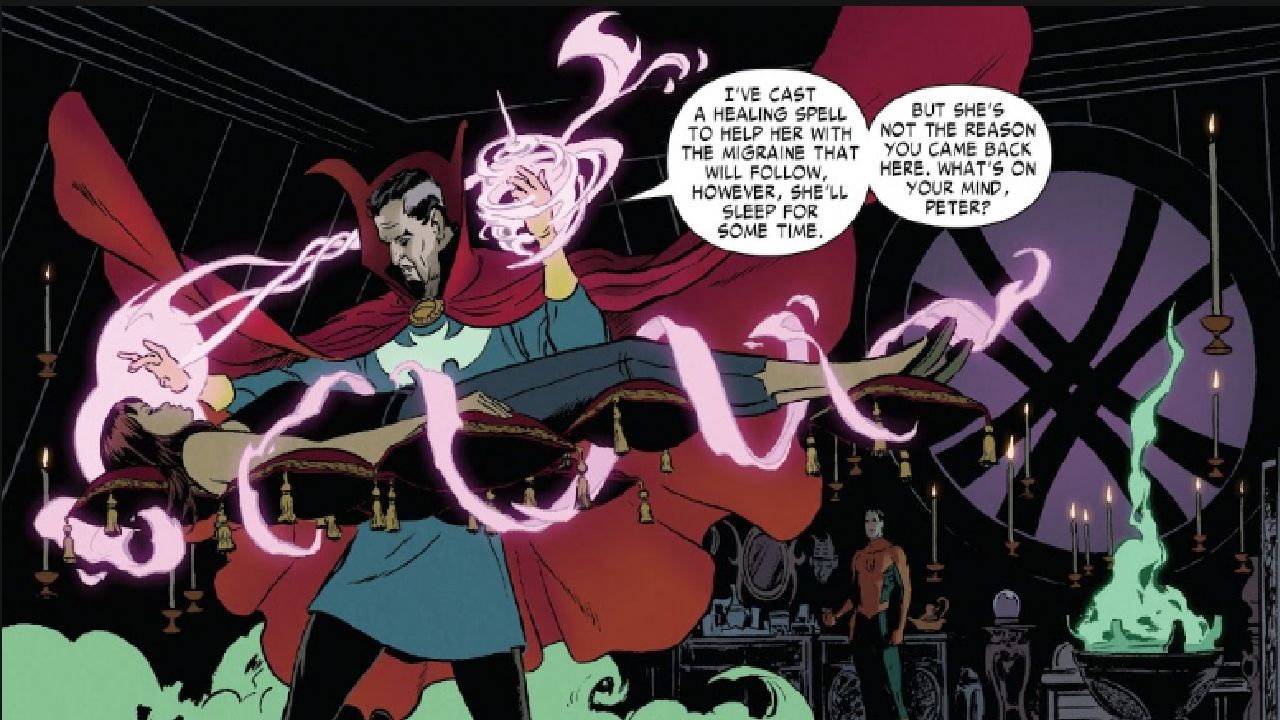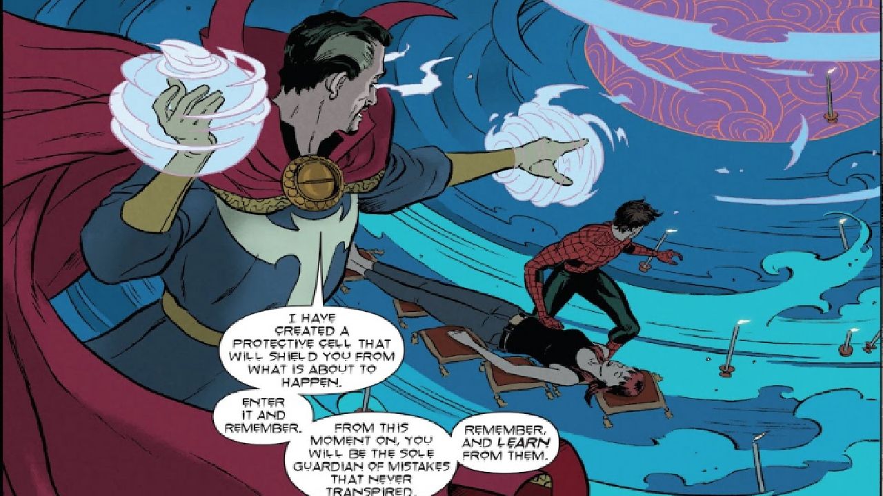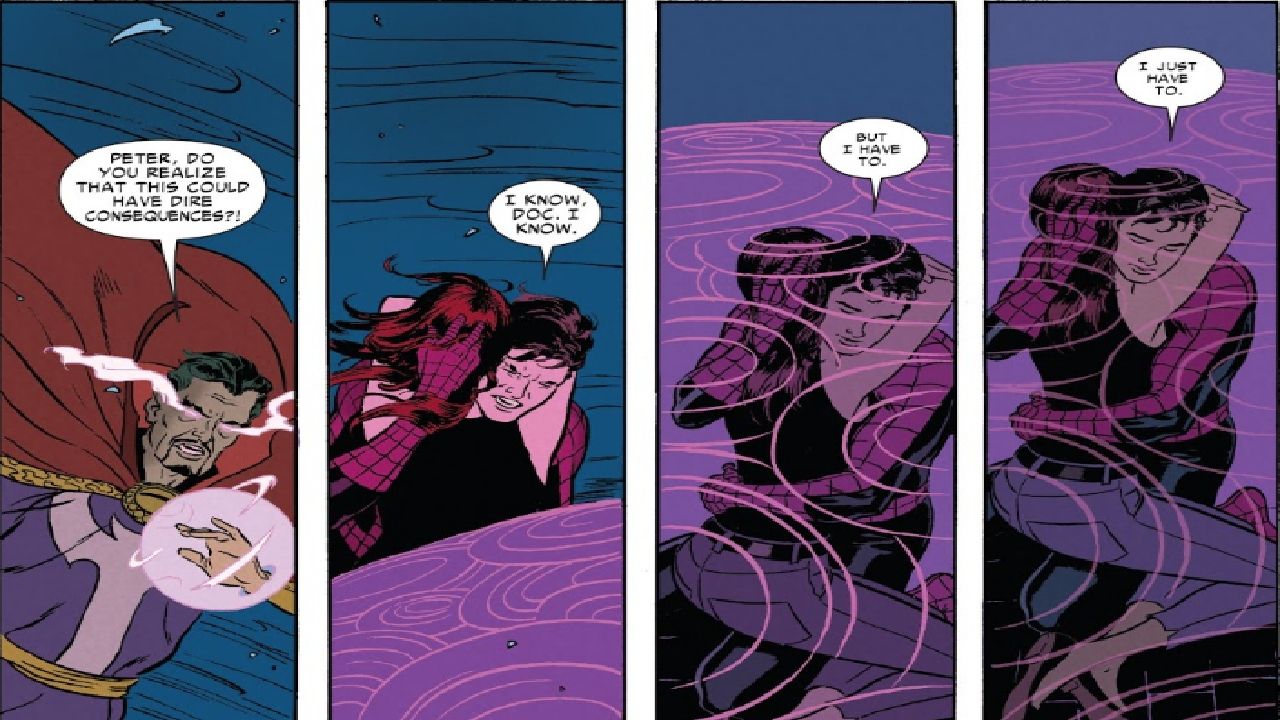 Pero ni en las historietas se queda en paz. De último momento, Parker jala a Mary Jane para conservar a alguien en su vida. Antes de olvidarlo, Strange le advierte que la magia dejará ser tener efecto en todos aquellos que conozcan su verdadera identidad, es decir, los recuerdos florecerán. A los primeros que recupera son a Los Cuatro Fantásticos, sus primeros aliados en su historia como personaje. Un acto bastante nostálgico y en tributo para todos sus lectores.