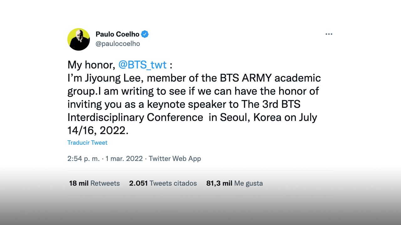 Según reporta Unnie Pop, fue el propio novelista brasileño quien informó a través de su cuenta personal de Twitter que "sería todo un honor" asistir a BTS: Conferencia Interdisciplinaria Global, un espacio dedicado a conversar y dimensionar el impacto de los Bangtan Boys en el mundo actual, así como la huella que han marcado en rubros culturales, económicos y políticos de Corea del Sur.