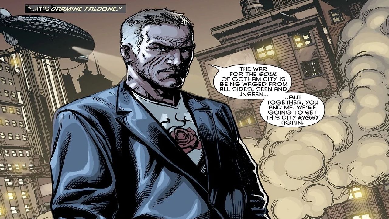 Le apodan El romano por establecer un imperio en las calles de Gotham, herencia de su padre Vincent. Su modus operandi siempre se desarrolló bajo las sombras; fue inmisericorde con sus enemigos y embustero con sus aliados, Carmine Falcone nació de la oscura imaginación de Frank Miller para liderar una compleja organización mafiosa cuya corrupción llegó a las más altas esferas políticas y de la autoridad de la ciudad, tal y como se muestra en The Batman, del cineasta Matt Reeves.