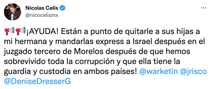 A través de un hilo de Twitter, Celis explicó que están "a punto de quitarle a sus hijas a mi hermana y mandarlas express a Israel". El productor detalló que el padre de las pequeñas, de origen israelí, busca restituirlas en el país de Oriente Medio en contra de su voluntad, pues de viva voz, las niñas, han expresado sus intenciones de quedarse junto a su madre en México.