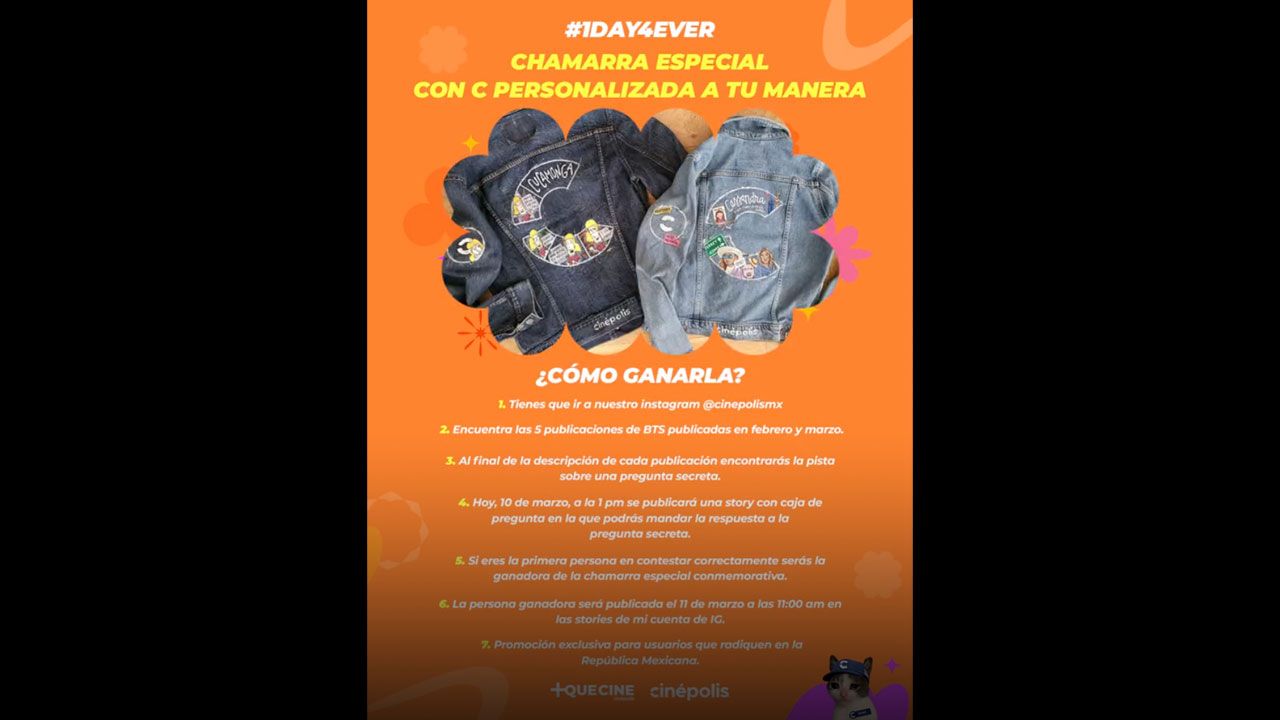 A la 1PM de hoy, horario de México, Cinépolis posicionará una caja de respuestas en sus stories, donde deberás depositar la respuesta correcta. Si eres la primera persona en responder, te llevarás la chamarra personalizada de BTS. Si bien no suena nada fácil, ¡confiamos en ARMY! El concurso terminará hoy en punto de las 23:59 horas y el o la ganadora será anunciado mañana a las 11AM a través de las redes sociales de Cinépolis.