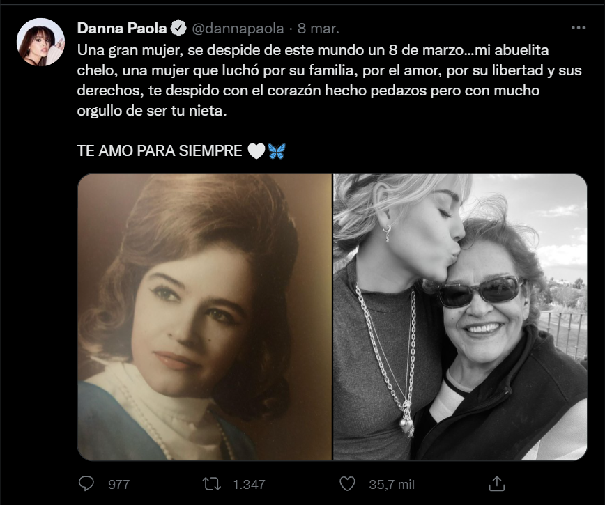 El pasado 8 de marzo compartió en sus redes sociales una lamentable noticia: su abuela había fallecido por complicaciones derivadas de covid-19, motivo por el que compartió un extenso mensaje de despedida: "Una gran mujer, se despide de este mundo un 8 de marzo…mi abuelita chelo, una mujer que luchó por su familia, por el amor, por su libertad y sus derechos, te despido con el corazón hecho pedazos pero con mucho orgullo de ser tu nieta. Te amo para siempre", escribió Danna Paola.