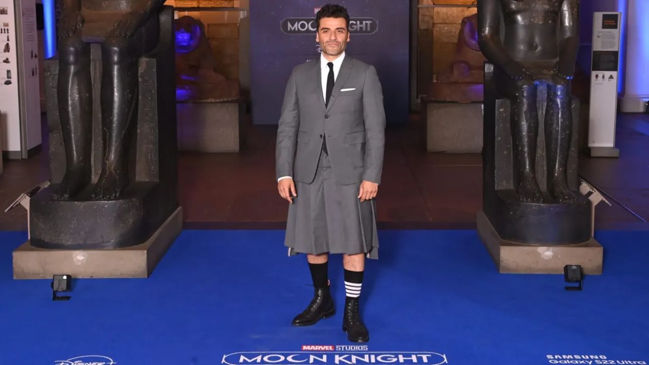 ¡Sí! El actor, que recientemente protagonizó El contador de cartas de Paul Schrader (Taxi Driver) y Duna de Denis Villeneuve; arrasó con la alfombra roja de Moon Knight en Londres utilizando una falda gris a juego con un saco y unas botas negras.