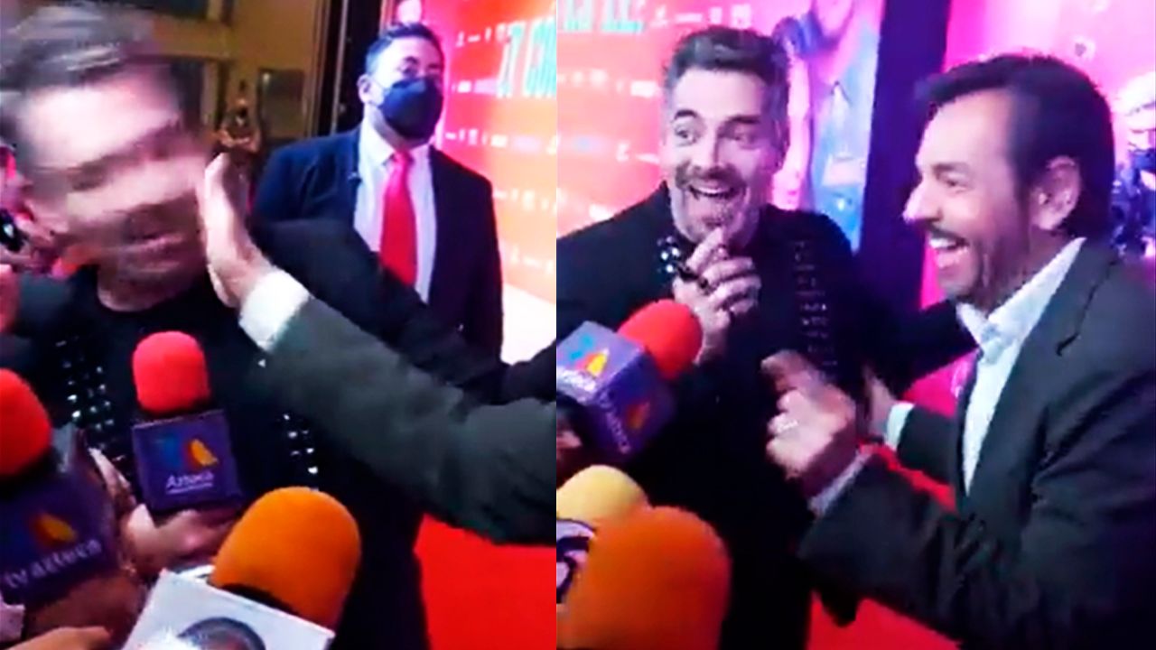 La polémica cachetada que propinó Will Smith a Chris Rock en los premios Oscar 2022 fue recreada por Eugenio Derbez y Omar Chaparro, quienes se reencontraron en la alfombra roja de ¿Y cómo es él?, película que llegará a cartelera de nuestro país el próximo 7 de abril.