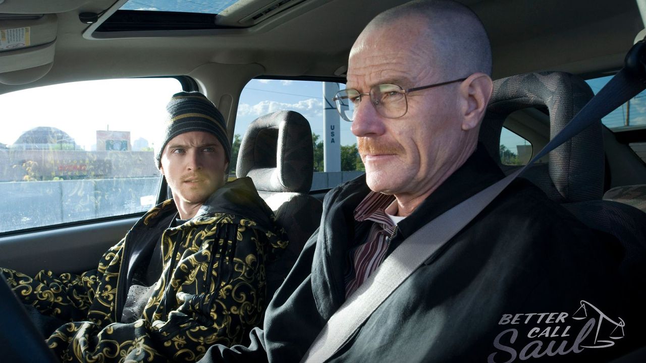 En la imagen revelada en Twitter por la cuenta de Better Call Saul, podemos observar a los populares actores en sus papeles como Walter White y Jesse Pinkman; ambos se encuentra dentro de un automóvil en movimiento, incluso visten el mismo estilo de prendas que tanto los caracterizan: por un lado una combinación sobria de White y del otro, Jesse con una pintoresca hoodie y gorro para el frío.