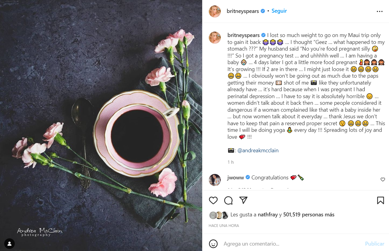 La publicación ya superó las 500 mil interacciones en Instagram, incluso cuenta con un comentario de Paris Hilton: "Felicidades hermana. Estoy tan emocionada por ti, te quiero". Por el momento Spears no ha revelado mayor información sobre el bebé.