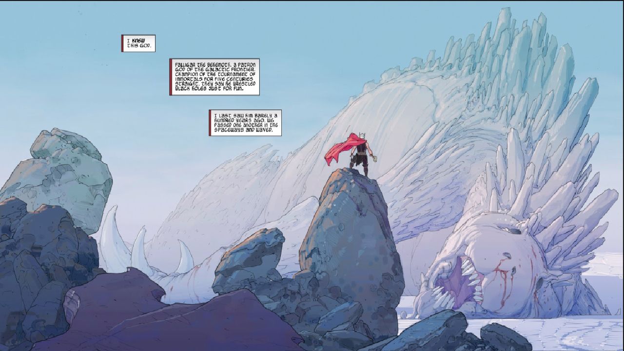 Se trata del cadaver de Falligar The Behemoth, campeón del torneo de los inmortales y aniquilador de hoyos negros. Aliado de Thor en varias incursiones espaciales. Su amigo. Fue asesinado por Gorr en el número 3 de la mencionada serie, donde el dios del trueno, joven, adulto y maduro se enfrenta a una de las mayores amenazas asgardianas y verdugo de varios miembros del famoso y divino Pantheon. Al momento de ser descubierto por el hijo de Odin, cinco años habían pasado de su deceso y más de un siglo desde la última vez que surcaron la galaxia juntos.