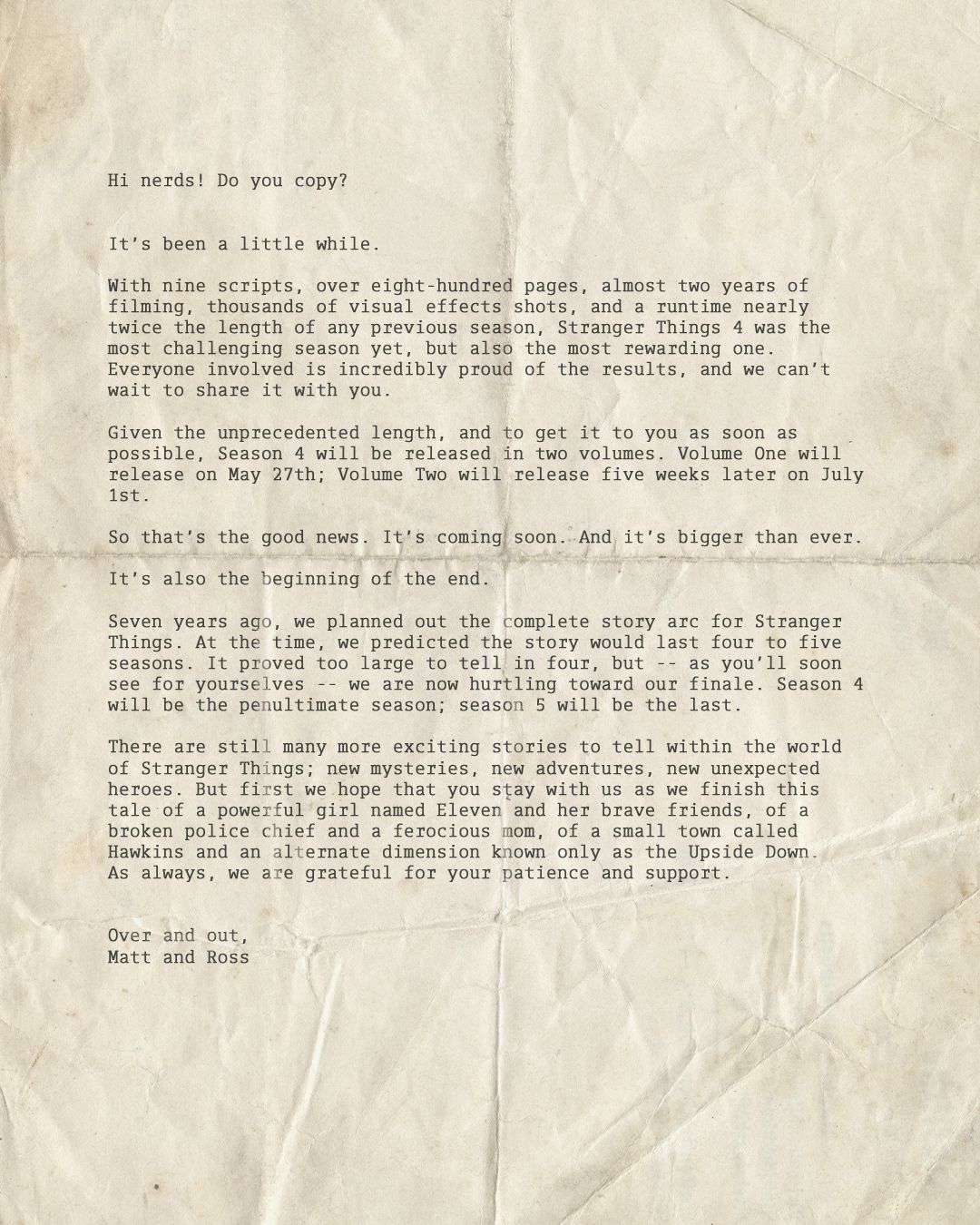 "¡Hola nerds! ¿Nos copian? Ha pasado un poco de tiempo. Con nueve guiones, más de ochocientas páginas, casi dos años de filmación, miles de tomas de efectos visuales, y una duración de casi el doble de la duración de cualquier temporada anterior, Stranger Things 4 fue la temporada más difícil, pero también la más gratificante", escribieron los hermanos Duffer.