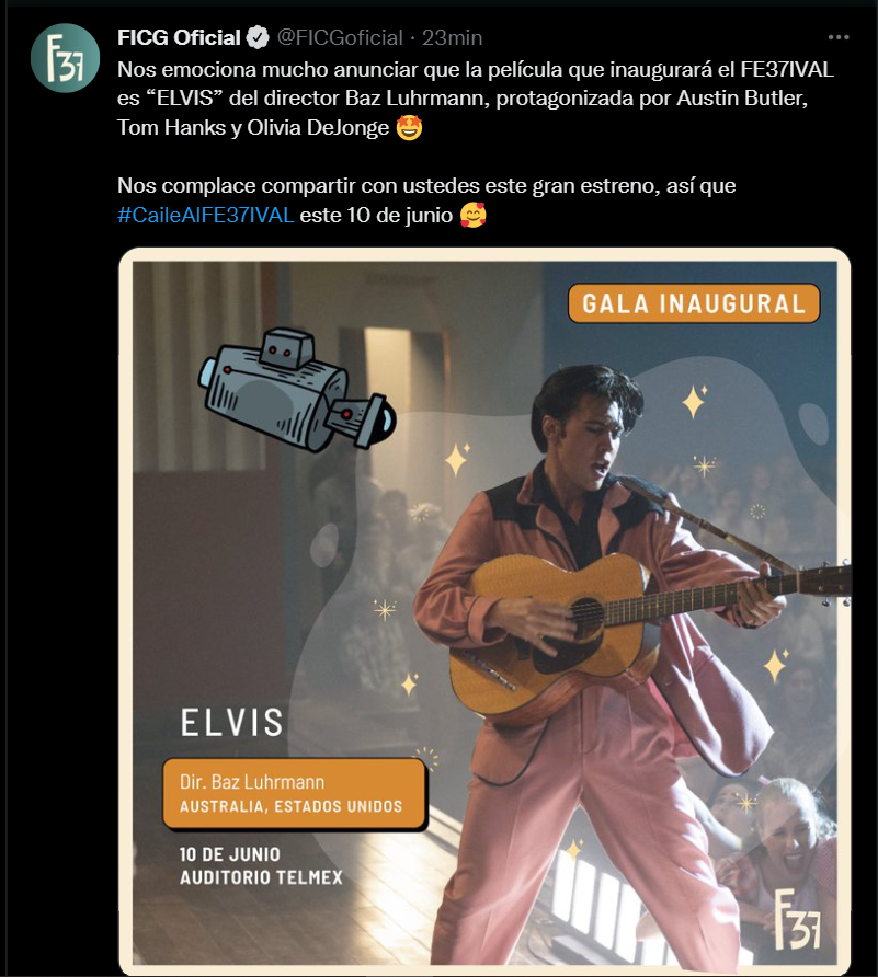 La 37 edición del Festival Internacional de Cine de Guadalajara (FICG) se llevará a cabo del 10 al 18 de junio y, como cada año, presentará una selección de películas nacionales e internacionales que ningún amante del séptimo arte querría perderse, especialmente cuando se trata de títulos como Elvis de Baz Luhrmann, producción que hace poco tuvo un exitoso paso por el Festival de Cannes. También se confirmó que Lightyear, lo nuevo de Disney, tendrá una proyección especial.