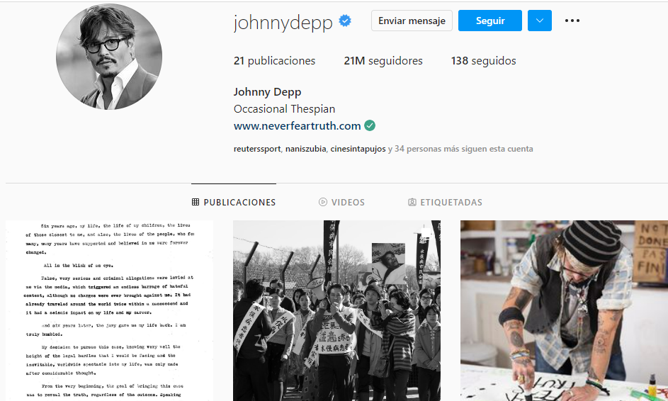 Y es que una vez finalizado el juicio, Depp no tardó en publicar en sus redes sociales un comunicado en el que expresaba sentirse liberado y en el que externó su agradecimiento a todos los que le brindaron su apoyo. Fueron cuestión de minutos para que el actor alcanzará más de un millón de seguidores como muestra de aprobación.