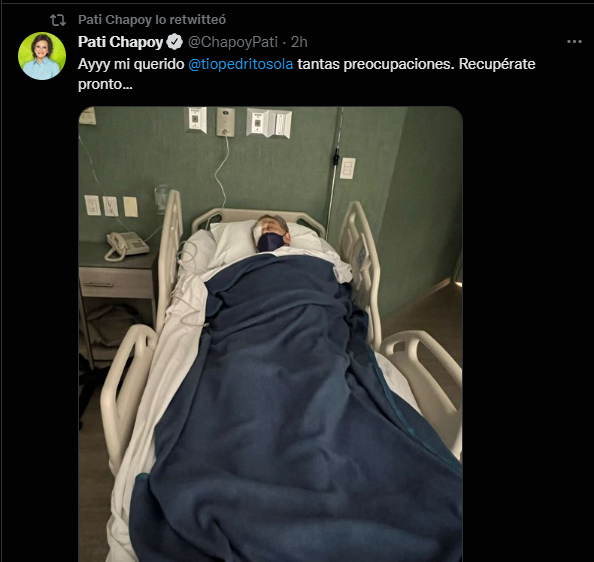 Por el momento no se ha revelado el estado de salud de Pedrito Sola ni las causas por las que tuvo que ser intervenido dentro de un hospital. Mientras tanto, usuarios de Twitter siguen demostrando su descontento con Pati Chapoy al compartir la imagen de su compañero en estado convaleciente.