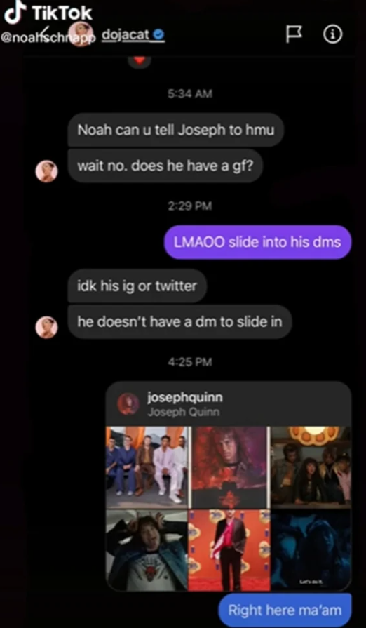 Todo surgió durante un video de TikTok publicado por Noah Schnapp, donde compartió la conversación que mantuvo con la rapera Doja Cat, quien demostró gran interés en su compañero de reparto. Incluso le preguntó si Joseph Quinn tenía novia, esto a las cinco de la mañana, por lo que, claramente, tiene interés en el actor británico.