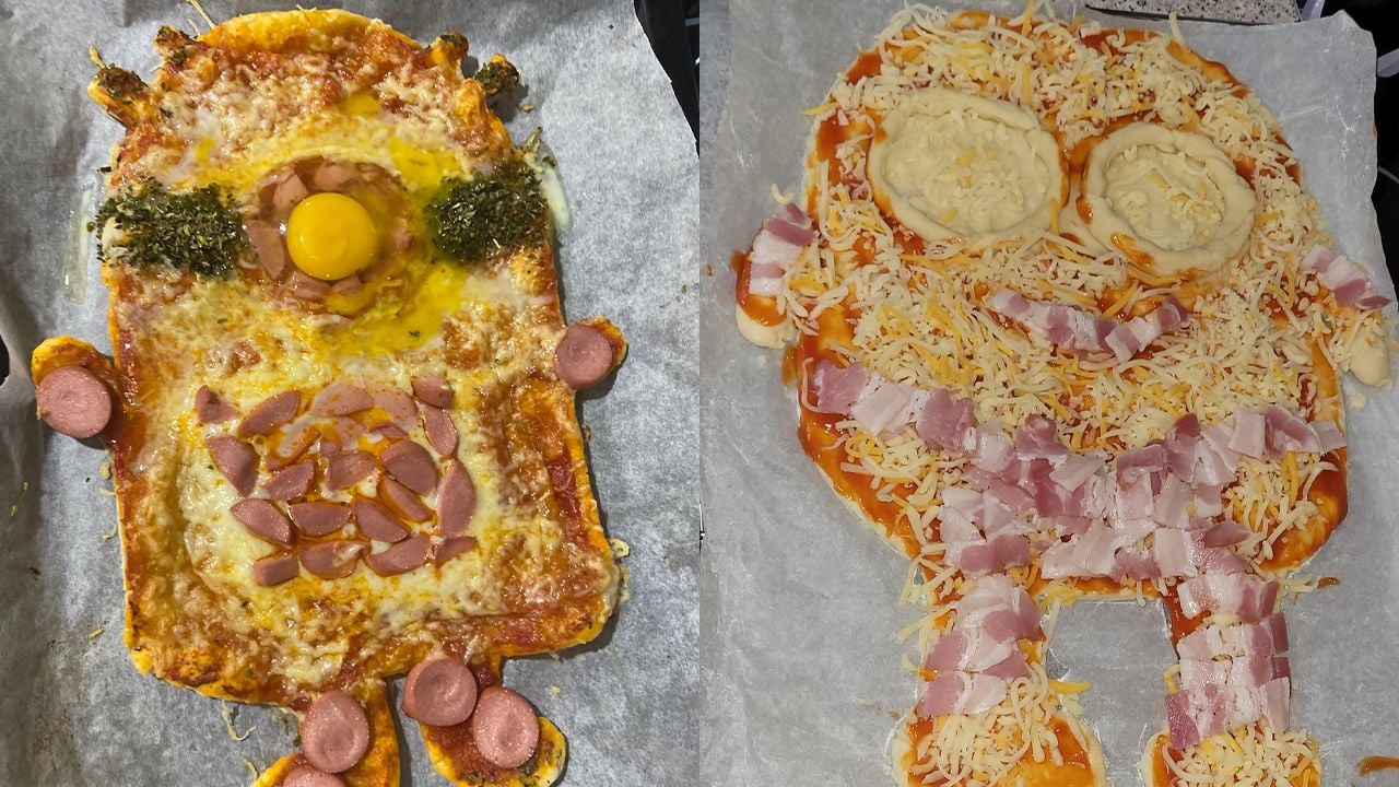 Para los ojos se debe añadir dos huevos estrellados, así es, huevo. Si eres de los que les parece abominable la combinación de pizza con piña, probablemente esta idea no te agrade tanto, pero venga, ¿de qué otra manera haríamos los ojos? Para el famoso overol solo se necesitan trocitos de jamón y ¡Gualá!