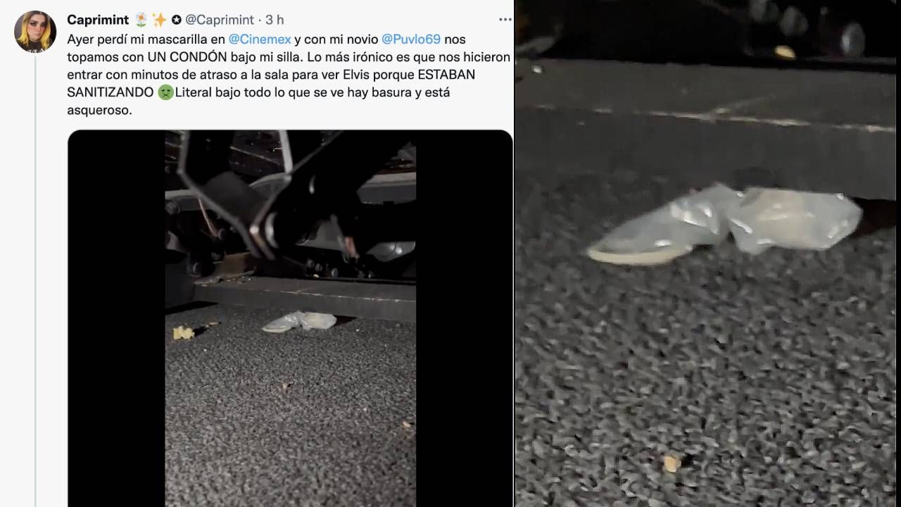 "Nos topamos con un condón bajo mi silla. Lo más irónico es que nos hicieron entrar con minutos de atraso a la sala porque estaban sanitizando", explicó en un video acompañado de su reclamo dirigido y taggeado a Cinemex.