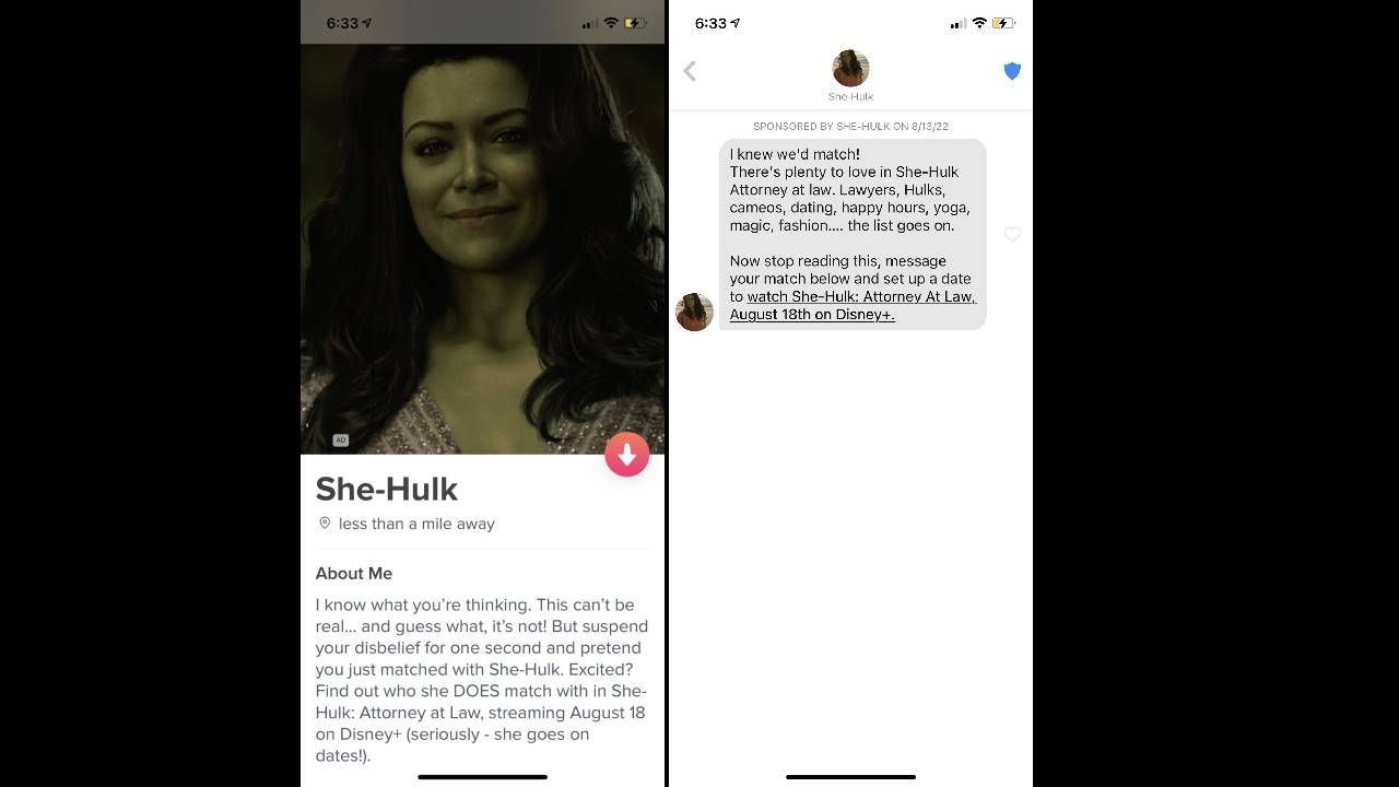 Estamos a dos días de ver los primeros episodios de She-Hulk: Defensora de héroes, la nueva serie de Marvel para la plataforma Disney Plus, y ésta ya se voló la barda con su forma de promoverla: utilizó una aplicación para citas donde todos los que buscan un conocer a alguien se encontrarán con Jennifer Walters (Tatiana Maslany), la prima de Bruce Banner (Mark Ruffalo) que está por debutar con la mujer verde en el universo Earth-199999.