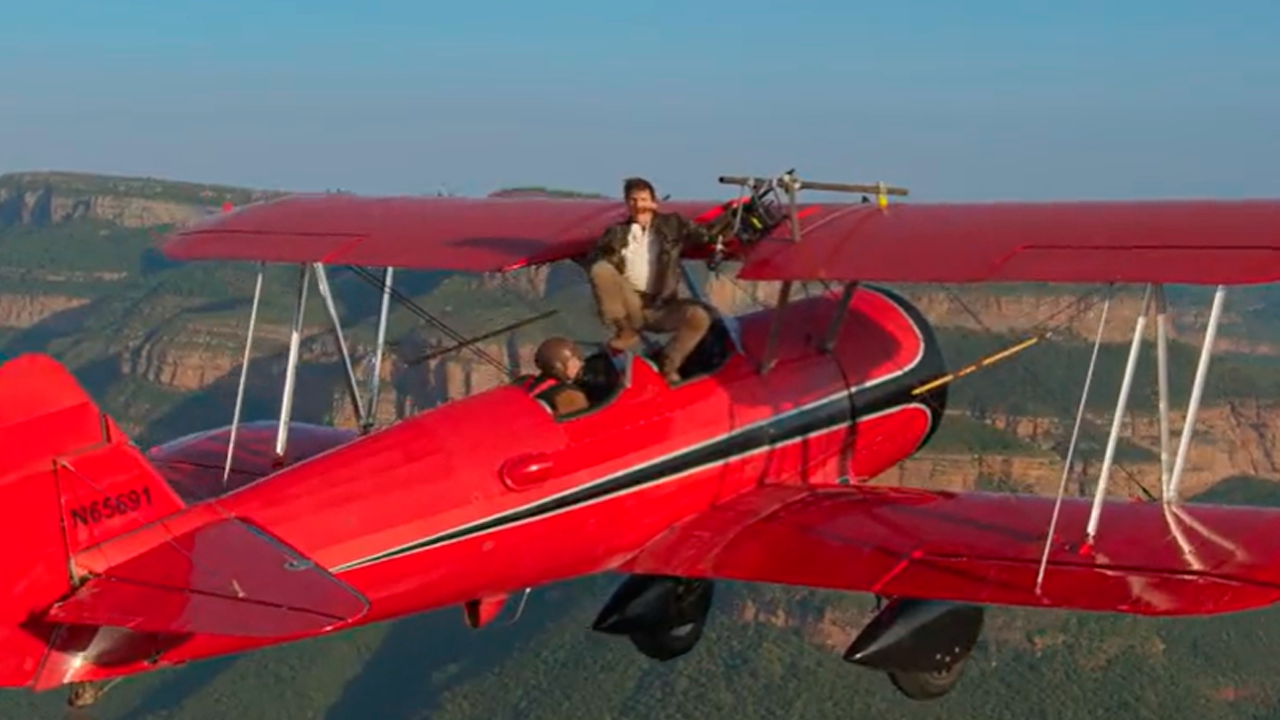 Recién termina el discurso, la avioneta gira drásticamente y vemos al actor en la misma posición sin ningún tipo de seguridad, demostrando que Tom Cruise no le teme a nada y es adicto a la adrenalina.