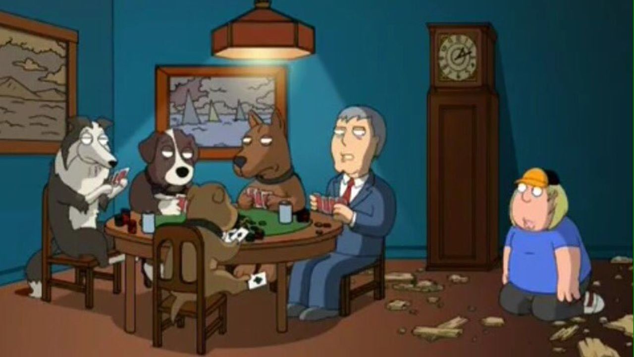 En el episodio de Family Guy, ‘Salvando al soldado Brian’, que puedes ver ahora mismo en Star Plus, se descubre al alcalde West jugando al póquer con perros. Mientras que en el episodio ‘Camino a Rhode Island’, Stewie comenta sobre las pinturas de Perros jugando al póquer que cuelgan de una pared y sugiere que, dado que Jesús está solo en una de las otras pinturas, los perros deberían invitarlo a su juego de cartas.