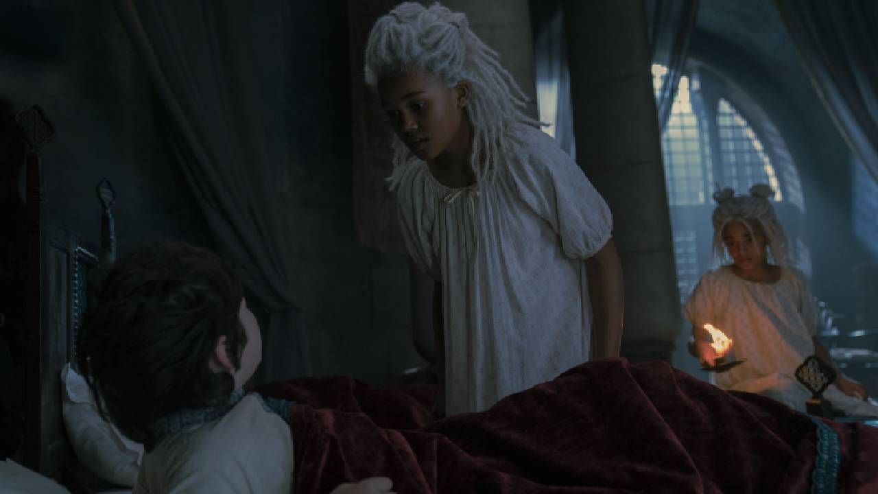 En el libro, Aemond (Leo Ashton) es descubierto por Joffrey Velaryon, el menor de los hijos de "La delicia del reino" y Harwin Strong (Ryan Corr), en su camino por dominar a Vaghar, la anciana dragona que perteneció a Laena Valeryon (Savannah Steyn) muerta en el capítulo seis luego de un parto accidentado, entonces el pequeño de tres años corrió de regreso a avisar a sus hermanos Jacaerys, de seis; y Lucerys, siete, quienes lo golpearon con espadas de madera apenas descendió el escupefuegos.