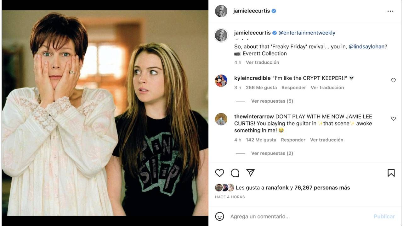 Porque esta mañana Jamie Lee se tomó muy en serio la petición de sus fans mexicanos y le ha lanzado la pregunta a su amiga por medio de un post en Instagram. ¿Qué tal revivir la película, estás dentro Lindsay Lohan? Ella aún no ha respondido, pero si las dos están en el mismo canal es mero trámite para que alguien se anime a continuar una de las mejores comedias que han hecho ambas y que pueden ver en Disney Plus.
